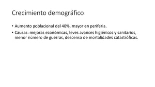 El documento describe las transformaciones económicas en España en el siglo XVIII, incluyendo el crecimiento demográfico, las mejoras en la agricultura y la industria, y el comercio con América. Destaca el desarrollo de Cataluña, donde se sentaron las bases para la futura industrialización textil, con la producción de aguardiente y lana. También resalta las reformas agrarias y fiscales para estimular la economía.