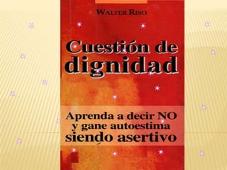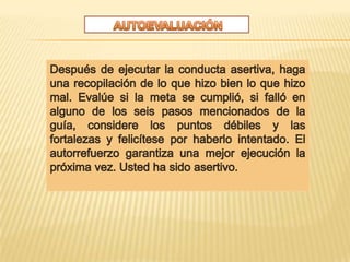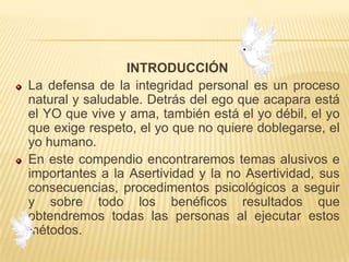 Este documento trata sobre la asertividad y la no asertividad. En la introducción, explica que defender la integridad personal es un proceso natural y saludable. Luego, la primera parte define la asertividad como la capacidad de ejercer y defender los propios derechos personales, mientras que la no asertividad implica no poder expresar sentimientos y pensamientos. Finalmente, explica que la asertividad fortalece la autoestima y dignidad, al permitir resistirse a ser explotado o utilizado.
