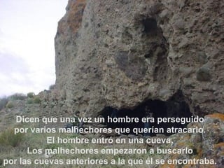 Un hombre perseguido por malhechores se escondió en una cueva y le pidió a Dios que pusiera un muro o ángeles para proteger la entrada, pero solo apareció una araña tejiendo una telaraña. Cuando los malhechores llegaron, decidieron no entrar a la cueva al ver la telaraña, salvando así la vida del hombre. Aunque a veces pedimos grandes cosas, Dios provee lo que realmente necesitamos a través de medios pequeños si confiamos en Él.
