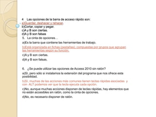 Este documento contiene 10 preguntas sobre las funciones y características básicas de Access 2010. Proporciona información sobre cómo cerrar el programa (Archivo > Salir o CTRL+F4), qué barra contiene las opciones de minimizar y cerrar (la barra de título), y qué elementos contiene la cinta de opciones (pestañas y grupos de herramientas). También resume que se puede ocultar la cinta de opciones y utilizar accesos directos de teclado, y dónde encontrar la ayuda y opciones para ab