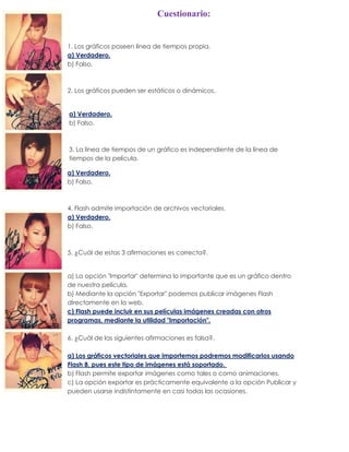 El documento presenta un cuestionario sobre gráficos y características de Flash. Las preguntas cubren temas como si los gráficos tienen línea de tiempo propia, si pueden ser estáticos o dinámicos, si admiten importación de archivos vectoriales, y las diferencias entre gráficos y clips de película.