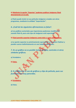 Este documento presenta un cuestionario de 8 preguntas sobre gráficos y características de Flash. Las preguntas cubren temas como líneas de tiempo de gráficos, tipos de gráficos, importación de archivos, opciones de exportación e importación, y las diferencias entre gráficos y clips de película. El cuestionario ofrece dos opciones de respuesta para cada pregunta y pide al lector que seleccione la respuesta correcta.