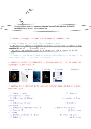 Este documento presenta un cuestionario de computación del primer semestre. Algunas de las preguntas incluyen identificar ventajas de usar computadoras, asociar características con generaciones de computadoras, clasificar componentes de hardware, completar atributos de software libre, identificar ventajas y desventajas de software libre, y ordenar los pasos para instalar Ubuntu.