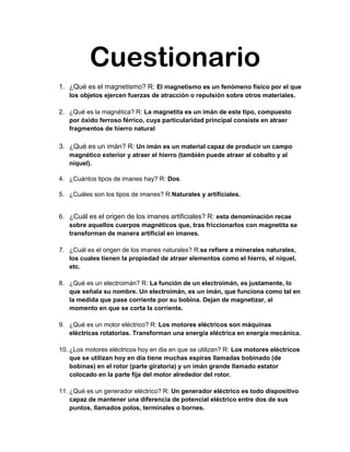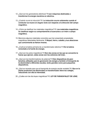 El documento contiene 20 preguntas y respuestas sobre conceptos magnéticos y eléctricos. Explica que el magnetismo es un fenómeno por el cual los objetos ejercen fuerzas de atracción o repulsión, y que existen dos tipos de imanes: naturales y artificiales. También define conceptos como electroimán, motor eléctrico, generador eléctrico, inducción eléctrica, clasificación de materiales magnéticos, bobina primaria de un transformador, polos magnéticos y las dos leyes magné