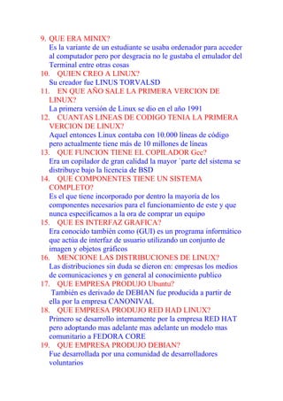 Richard Stallman fue un programador del MIT que renunció en 1984 para fundar el Proyecto GNU y la Free Software Foundation con el objetivo de promover el software libre. Linux fue creado por Linus Torvalds en 1991 como núcleo de un sistema operativo, combinándose luego con el software de GNU para formar los sistemas operativos GNU/Linux distribuidos por compañías como Red Hat, Debian, Ubuntu y SUSE.