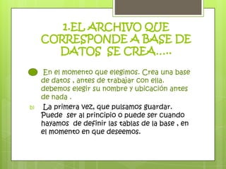 Este documento contiene un cuestionario de 10 preguntas sobre conceptos básicos de bases de datos en Microsoft Access. Las preguntas cubren temas como la creación y extensión de archivos de bases de datos, el panel de navegación, cómo abrir y cerrar bases de datos, y los elementos fundamentales de una base de datos como tablas, consultas, registros y campos.