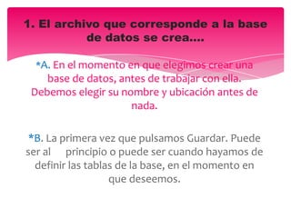 Este documento contiene preguntas sobre conceptos básicos de bases de datos en Access como la creación y apertura de bases de datos, los elementos principales como tablas y consultas, y el manejo de datos. Explica que al crear una base de datos debemos elegir su nombre y ubicación, que al guardarla por primera vez se crea un archivo con extensión ACCDB, y que el panel de navegación contiene y permite ocultar/mostrar los elementos creados como tablas, consultas y formularios.