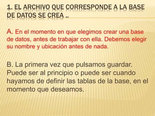 Este documento contiene 10 preguntas sobre conceptos básicos de bases de datos en Microsoft Access 2010. Las preguntas cubren temas como la creación y extensión de archivos de bases de datos, el panel de investigación, cómo abrir y cerrar bases de datos, los elementos más importantes como tablas y consultas, y la estructura básica de una tabla compuesta por campos y registros.