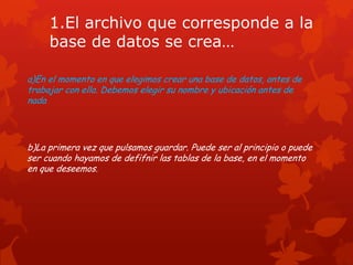 El documento contiene preguntas y respuestas sobre bases de datos en Access 2010. Explica que la base de datos se crea antes de trabajar con ella, que las extensiones son ACCDB, y que el panel de navegación contiene los elementos de la base de datos y está situado en la izquierda. También cubre cómo cerrar una base de datos abierta, formas de abrir una base de datos, y que la tabla es el elemento más importante.