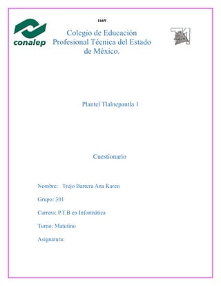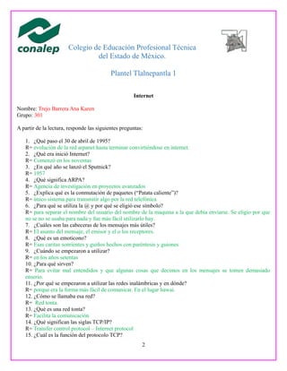 Este documento contiene las respuestas de Ana Karen Trejo Barrera a un cuestionario sobre historia de Internet. Responde preguntas sobre el surgimiento de Internet a partir de ARPANET en 1969, el uso de protocolos como TCP/IP, el desarrollo de páginas web y navegadores en la década de 1990, y el surgimiento de redes sociales y sitios populares como Google, Facebook y Wikipedia desde el 2000 en adelante.
