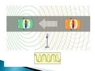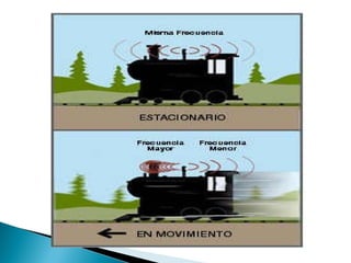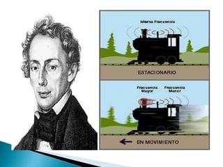 El documento describe el efecto Doppler, nombrado así por Christian Doppler quien investigó cómo la frecuencia de una onda cambia cuando la fuente emisora y el observador se mueven el uno respecto al otro. Explica que si la fuente se aleja la frecuencia de la onda percibida es menor, mientras que si se acerca es mayor, y proporciona ejemplos cotidianos como objetos en movimiento donde se aprecia este cambio de frecuencia.