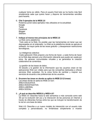 Este documento presenta un cuestionario sobre Tecnologías de la Información y Comunicación (TICs) y la Web 2.0. El cuestionario contiene 30 preguntas que abarcan temas como la definición de TICs, los campos de acción de los TICs, la diferencia entre la Web 1.0 y 2.0, ejemplos de herramientas de la Web 2.0 como Google y Facebook, y cómo se aplica la Web 2.0 en áreas como la educación y el trabajo. El objetivo del cuestionario es evaluar los conocimientos ad