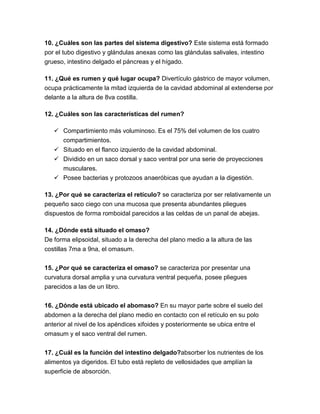 El documento describe la anatomía del sistema digestivo de los animales poligástricos o rumiantes. Estos animales tienen un estómago complejo formado por cuatro compartimientos: el retículo, el rumen, el omaso y el abomaso. El sistema digestivo transforma los alimentos en nutrientes simples que son absorbidos en el intestino delgado y transportados a las células a través de la sangre. Los rumiantes se caracterizan por su estómago de cuatro cámaras y por remasticar los alimentos.