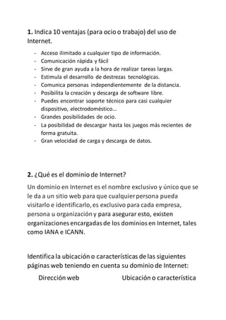 El documento proporciona información sobre el funcionamiento y ventajas de Internet. Explica conceptos como dominios, navegadores, buscadores, herramientas de comunicación y tipos de redes. También describe elementos de hardware de redes como hubs, switches y routers, así como protocolos como TCP/IP.
