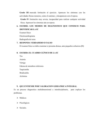 1. El documento contiene preguntas sobre diversos temas médicos como la diabetes, neumonía, demencia, insuficiencia cardíaca y valoración geriátrica integral. 2. Incluye preguntas sobre síntomas, clasificaciones, diagnósticos diferenciales y tratamientos de estas condiciones. 3. También pide definir algunos términos médicos y subrayar o señalar las respuestas correctas a preguntas sobre estos temas.