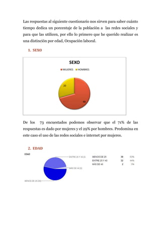 Este documento presenta los resultados de una encuesta sobre el uso de las redes sociales. La mayoría de los encuestados eran mujeres menores de 25 años que dedican entre 1 y 2 horas al día a las redes sociales, principalmente Facebook. Pasan ese tiempo chateando con amigos y viendo los perfiles de sus contactos.