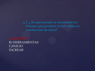 Este documento contiene un cuestionario de 10 preguntas sobre conceptos básicos relacionados con la creación y estructuración de tablas en una base de datos. Las preguntas abarcan temas como la pestaña donde se encuentran los botones para incluir tablas, la vista más adecuada para definir la estructura de una tabla, los campos mínimos que debe tener una tabla y sus propiedades, la clave principal y si es obligatoria, y cómo se definen y cierran las tablas.