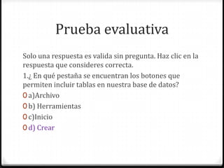 Este documento presenta 10 preguntas de opción múltiple sobre conceptos básicos de bases de datos, como la creación y estructuración de tablas, los tipos de datos de campos, las claves primarias y el relleno de datos. Las preguntas abarcan temas como la ubicación de los botones para incluir tablas, las vistas más adecuadas para definir la estructura de una tabla, los elementos mínimos requeridos para definir un campo, y las propiedades y requisitos de las claves primarias.