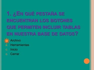 Este documento presenta un cuestionario de 10 preguntas sobre conceptos básicos relacionados con tablas en bases de datos, incluyendo dónde se encuentran los botones para incluir tablas, cómo definir la estructura y propiedades de una tabla, claves principales, tipos de datos válidos para campos y cómo cerrar una tabla.