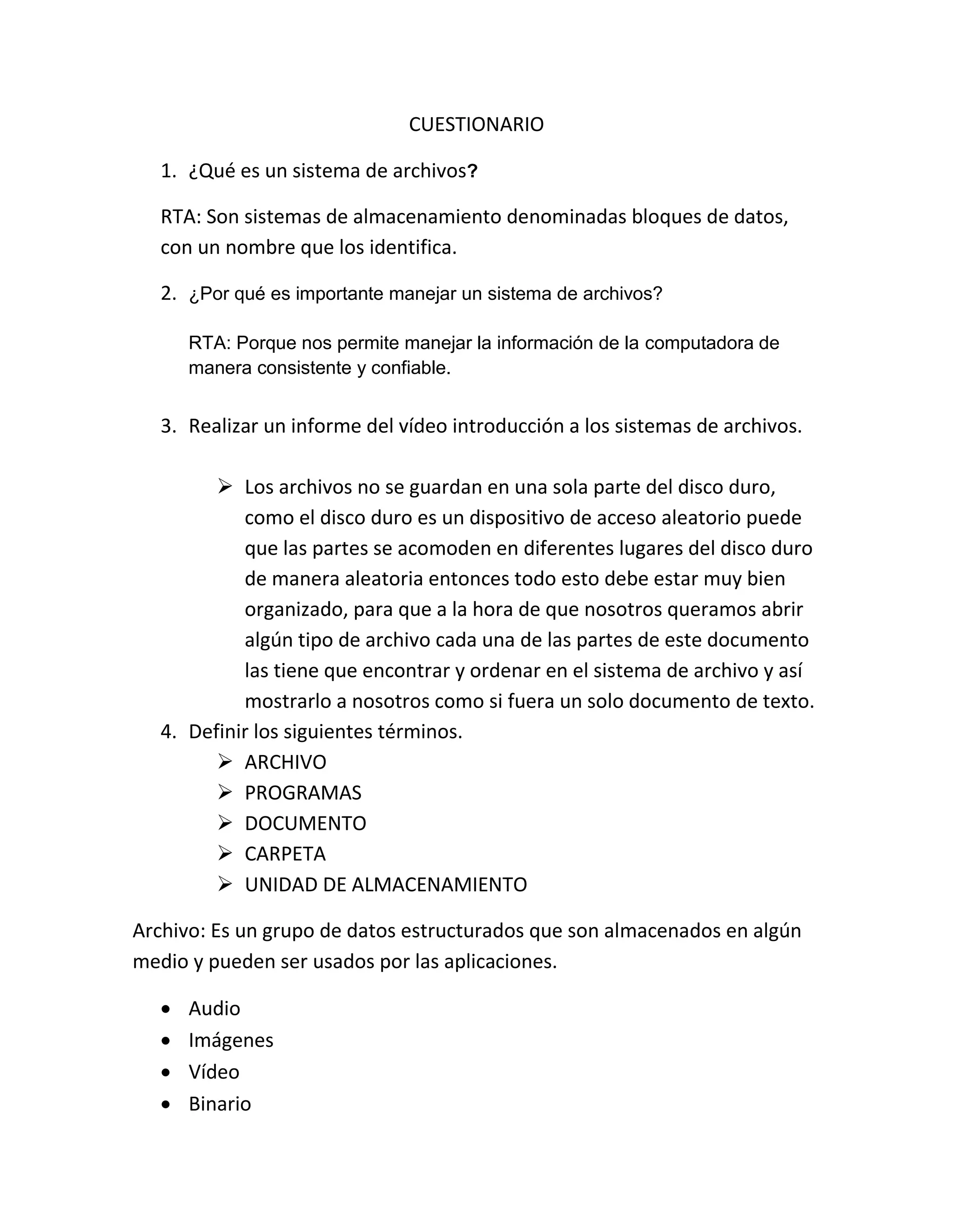 El documento presenta preguntas y respuestas sobre sistemas de archivos. Explica que un sistema de archivos organiza la información almacenada en la computadora en bloques de datos identificados con nombres. Las carpetas contienen archivos y otras carpetas de manera jerárquica, formando una estructura en árbol. Los archivos se pueden crear, abrir, cerrar, borrar y modificar, y se les asignan permisos y extensiones para protegerlos.