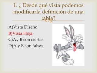 Este documento contiene 10 preguntas sobre el uso de vistas y herramientas en una hoja de cálculo de Access. La vista Diseño se usa para modificar definiciones de tablas, mientras que la vista Hoja de datos permite insertar, borrar y modificar datos. En la vista Hoja de datos se puede desplazar entre registros usando flechas, páginas o la barra de desplazamiento. El botón Eliminar en la pestaña Registros sirve para borrar el registro activo. Al pulsar la flecha derecha en una celda se va al