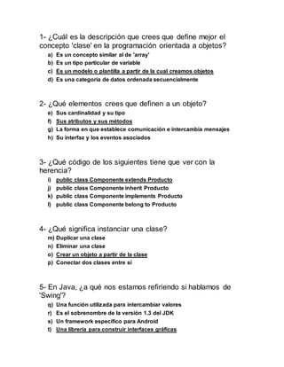 Este documento presenta 40 preguntas sobre conceptos básicos de programación orientada a objetos en Java. Algunas preguntas son de selección múltiple sobre temas como clases, objetos, herencia, instanciación, interfaces, sobrecarga de métodos y excepciones. Otras preguntas son verdadero/falso sobre clases para manejo de archivos binarios en Java. El documento parece ser parte de una evaluación para un curso de programación orientada a objetos.