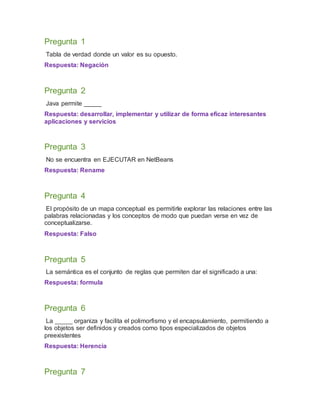 Este documento contiene 63 preguntas y respuestas sobre conceptos relacionados con programación orientada a objetos, Java, NetBeans y otros temas afines. Las preguntas abarcan desde definiciones básicas como qué es un operador o una clase, hasta aplicaciones más específicas como las ventajas de NetBeans o el lenguaje utilizado en Android. Las respuestas proporcionan información concisa sobre cada tema.