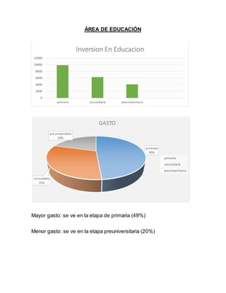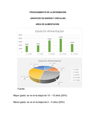 El documento presenta información sobre los gastos de una familia en diferentes áreas como alimentación, educación, vestido y recreación en diferentes etapas de vida de 0 a 17 años. Se aprecia que el mayor gasto en alimentación se da entre los 10 a 15 años, en educación durante la primaria, en vestido entre los 10 a 15 años, y los mayores gastos de recreación son para la promoción de secundaria. Se incluyen tablas y cuadros con detalles de los gastos en cada área.