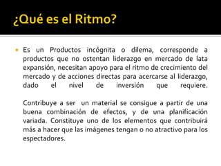 El documento habla sobre el ritmo y la diferencia entre dinamismo y acción. Define el ritmo como un producto que necesita apoyo para crecer en el mercado y acciones directas para acercarse al liderazgo. Explica que el dinamismo considera el mundo como formado por agrupaciones de elementos simples y fuerzas, mientras que la acción requiere dar más tiempo al espectador para leer planos generales con más información, evitando planos demasiado largos que pueden hacer perder interés. Finalmente, incluye dibujos de ritmos din