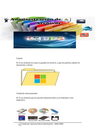Un explorador de archivos es un programa que administra archivos y carpetas, permitiendo organizar documentos de manera ordenada. Los archivos se almacenan en carpetas y unidades de almacenamiento, y pueden ser de diferentes tipos como texto, imágenes, video y audio. Existen operaciones básicas como escritura, lectura, apertura y cierre de archivos, y métodos para protegerlos y reducir su tamaño como la compresión.