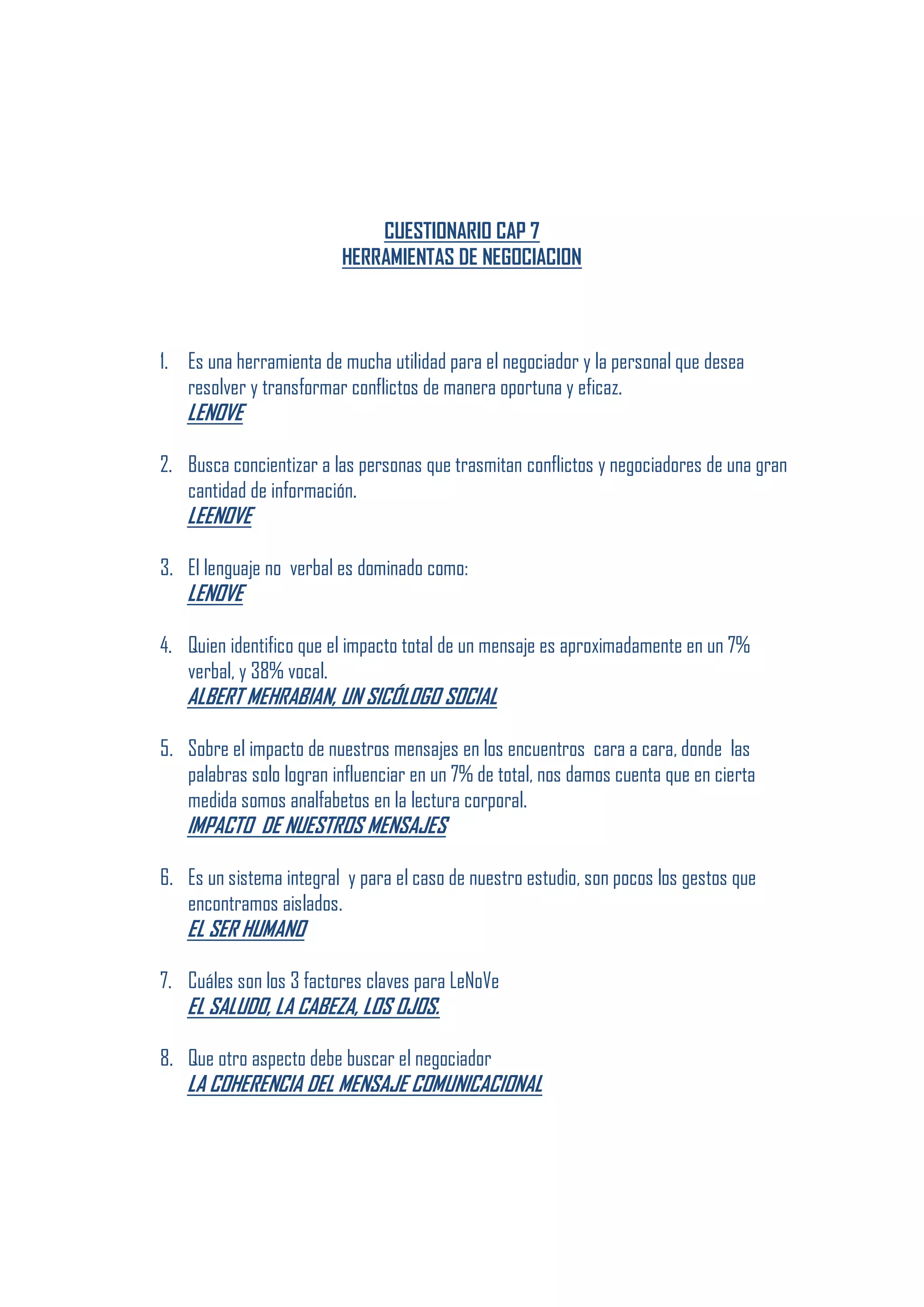 Este documento resume las herramientas de lenguaje no verbal (LeNoVe) que son útiles para los negociadores. Algunas de las herramientas clave discutidas incluyen saludos, contacto visual, sonrisas, posición de brazos y puños, y el uso de las manos. El documento también explica que el lenguaje no verbal transmite el 38% del impacto de un mensaje, por lo que es importante para los negociadores comprender e interpretar estos gestos y señales durante las conversaciones.
