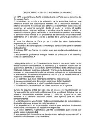 La Comuna de París de 1871 fue un movimiento obrero en Francia que se oponía a la instalación de la Asamblea Nacional y pretendía implementar reformas políticas y sociales como la igualdad salarial, la separación entre la Iglesia y el Estado, y el derecho de los obreros a ser propietarios de las fábricas. Los valores éticos de la burguesía se modificaron debido a su ascenso social luego de un gran crecimiento de la industria. La industrialización en Europa occidental repercutió en América Latina y Brasil