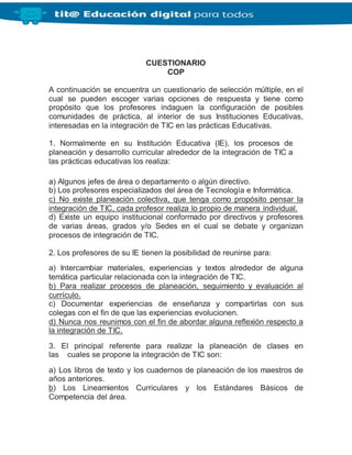 Este cuestionario de selección múltiple busca indagar sobre la configuración de posibles comunidades de práctica interesadas en la integración de TIC en las prácticas educativas al interior de las instituciones educativas. Consta de 8 preguntas sobre temas como la planeación curricular en torno a TIC, la posibilidad de que los profesores se reúnan para intercambiar experiencias, los recursos que se consideran pedagógicos y los espacios disponibles para discutir la integración de TIC.