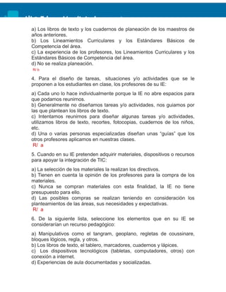 Este cuestionario busca indagar sobre la existencia y configuración de posibles comunidades de práctica relacionadas con la integración de TIC en las prácticas educativas al interior de instituciones educativas. Consiste en 8 preguntas de selección múltiple sobre temas como la planeación curricular, reuniones de profesores, diseño de actividades, adquisición de recursos y espacios de discusión sobre experiencias docentes con TIC.