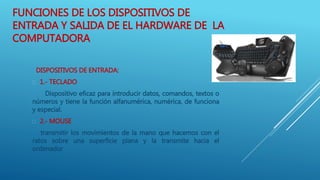 Este documento describe los dispositivos de entrada y salida de hardware de computadoras, incluyendo teclados, mouse, escáneres, cámaras web y micrófonos como dispositivos de entrada, y pantallas, impresoras y parlantes como dispositivos de salida. También discute los tipos de almacenamiento como discos duros, memorias flash y CDs. Además, proporciona medidas preventivas contra el robo y hardware malintencionado para centros de cómputo.
