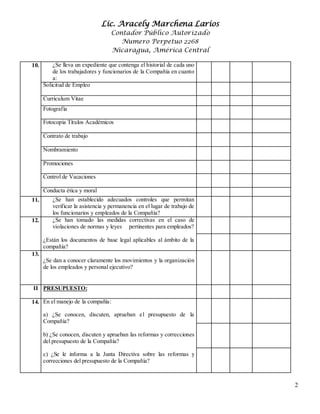 Este documento presenta un cuestionario de 75 preguntas sobre el control interno de una compañía. Las preguntas cubren varias áreas como la estructura organizativa, el presupuesto, las áreas contables y financieras, los documentos y cuentas por cobrar. El cuestionario evalúa si la compañía tiene políticas y procedimientos adecuados establecidos para cada área y si se están siguiendo dichas políticas.