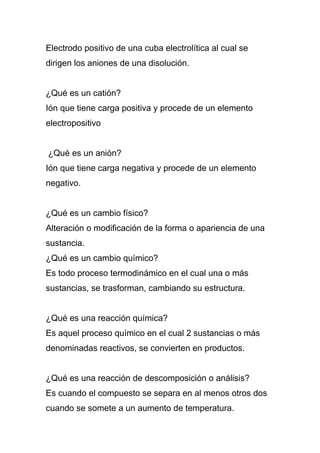 La electrólisis es un proceso químico donde una sustancia se descompone por la acción de una corriente eléctrica. Un electrolito es una sustancia que se descompone en la electrólisis, dirigiéndose los cationes hacia el cátodo y los aniones hacia el ánodo. Un cambio químico es un proceso termodinámico donde una o más sustancias se transforman cambiando su estructura.