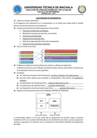 El documento presenta un cuestionario sobre informática con preguntas sobre sistemas operativos, hardware, software, memoria RAM, disco duro, procesadores y otros componentes de una computadora. El cuestionario contiene preguntas de selección múltiple y completar sobre estos temas con el fin de evaluar conocimientos básicos de informática.