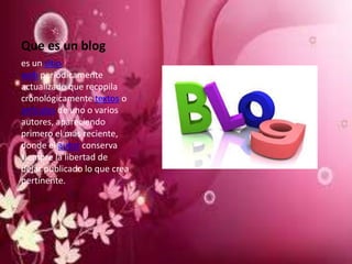 Este documento resume los conceptos clave sobre blogs. Define un blog como un sitio web actualizado periódicamente que recopila artículos de uno o más autores en orden cronológico, con el artículo más reciente primero. Explica que los blogs ofrecen acceso gratuito y ayudan a mejorar las habilidades tecnológicas de una manera personalizada, aunque a veces tienen demasiada información. Además, detalla los pasos para crear un blog y explica que un blog puede servir como un diario personal abierto al público.