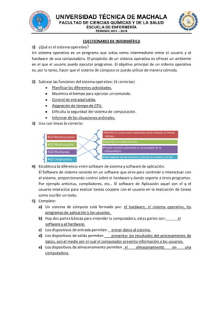 Este documento contiene 25 preguntas sobre informática dirigidas a estudiantes de enfermería. Las preguntas cubren temas como sistemas operativos, hardware, software, memoria RAM, discos duros y procesadores. El objetivo es evaluar los conocimientos básicos de los estudiantes sobre estos componentes y conceptos fundamentales de las computadoras.