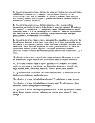 Este documento proporciona información sobre los lípidos. Explica que los lípidos son moléculas orgánicas compuestas principalmente de carbono, oxígeno e hidrógeno. Se clasifican en saponificables e insaponificables. Los saponificables incluyen ácidos grasos saturados e insaturados, mientras que los insaponificables incluyen terpenos, esteroides y eicosanoides. También identifica alimentos ricos en diferentes tipos de lípidos y cómo afectan los niveles de colesterol.
