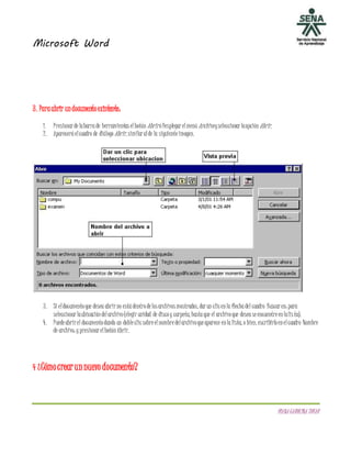 Este documento proporciona instrucciones sobre cómo realizar varias tareas comunes en Microsoft Word, como abrir y guardar documentos, seleccionar y copiar texto, insertar tablas e imágenes, y cambiar formatos de fuente y párrafo. Explica 30 pasos diferentes para completar estas tareas a través de los menús y opciones en Word.