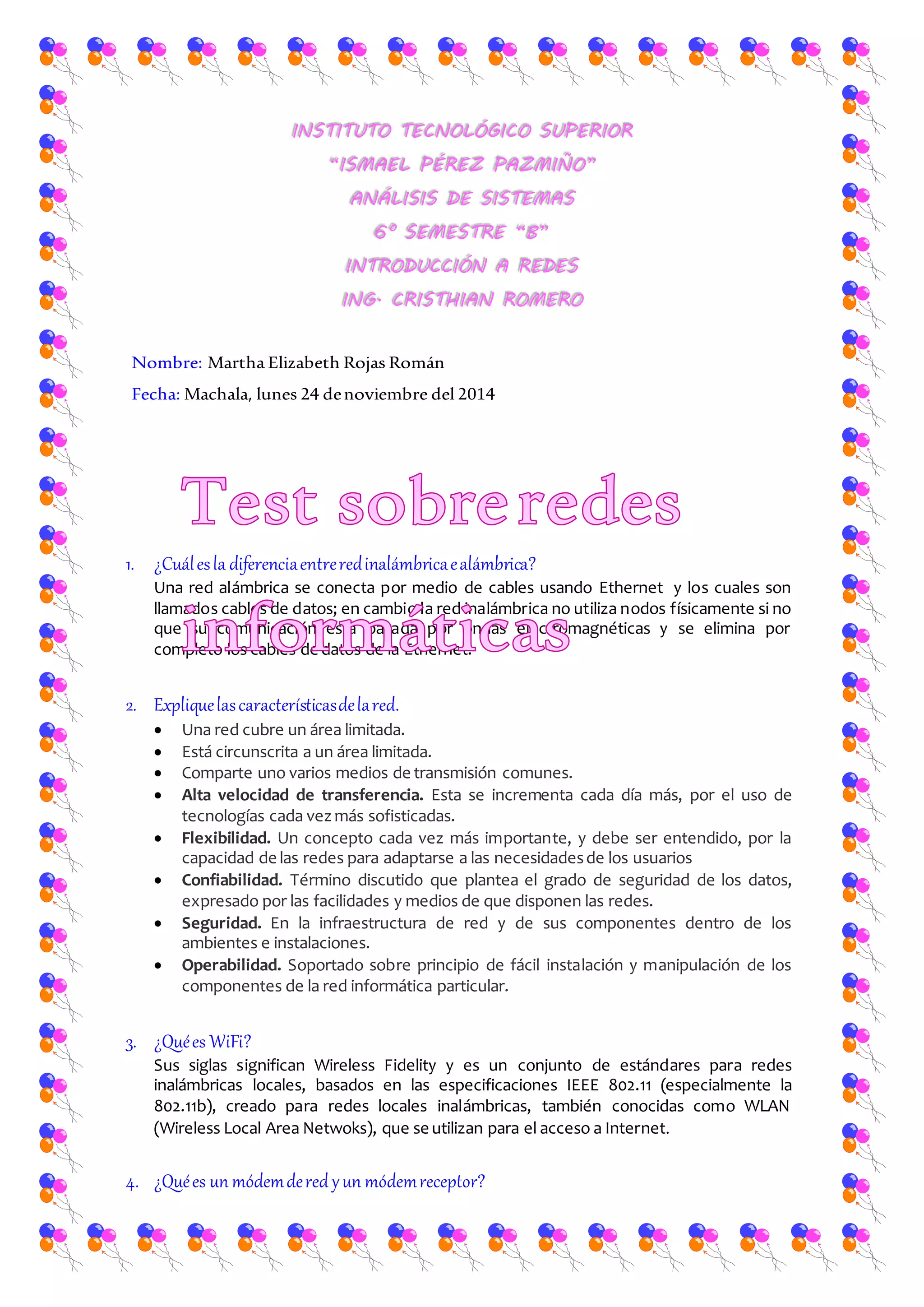 Este documento contiene las respuestas de Martha Elizabeth Rojas Román a 15 preguntas sobre redes. Explica las diferencias entre redes alámbricas e inalámbricas, describe los componentes de una red como switches, routers y servidores, y define conceptos clave como direcciones IP, máscaras de subred, puertas de enlace y DNS. También incluye ejemplos de diseños de redes alámbricas e inalámbricas con sus componentes y configuraciones de red.