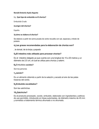 El chorizo es un embutido crudo de origen español que se elabora a partir de carne picada de cerdo mezclada con sal, especias y nitrato de potasio. Se suele rellenar en el intestino delgado de cerdo debido a su tamaño adecuado. Los jamones son embutidos cocidos obtenidos de las patas traseras de cerdo curadas y secadas, mientras que las salchichas son embutidos escaldados hechos de ingredientes cárnicos procesados y cocidos dentro de tripas.