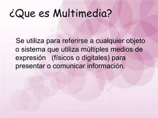 Multimedia se refiere a la presentación de información a través de múltiples formatos como imágenes, video y audio. Flash permite crear animaciones interactivas usando formatos como SWF que pueden reproducirse en los navegadores web. ActionScript es el lenguaje de programación usado en Flash para agregar interactividad mediante el uso de objetos, botones, clips de película y eventos.