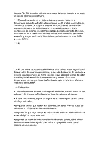 La fuente de poder convierte la energía de la red eléctrica en las tensiones necesarias para alimentar los componentes internos del computador, como +5V, +12V, -12V y -5V. Proporciona señales como POWER_GOOD y PS_ON para indicar el estado de energía a la tarjeta madre. Una fuente de poder inadecuada puede sobrecalentar los componentes y dañarlos, mientras que una falla en la fuente de poder puede causar errores en la memoria, reinicios espontáneos y otros problemas.