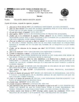 Este documento contiene las respuestas a 41 preguntas sobre la historia y el desarrollo de Internet. Algunas de las ideas clave incluyen: Internet comenzó como una red académica en 1969 y se abrió al público en general en 1995, el protocolo TCP/IP se estableció como estándar en 1983, el número de usuarios de Internet ha crecido exponencialmente de 1.7 mil millones en 2009 a más de 3 mil millones en la actualidad, sitios pioneros como Amazon, Wikipedia, Facebook y Google han transformado la forma en que las personas se comunic