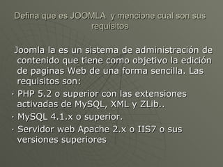 Joomla es un sistema de administración de contenidos para crear páginas web de forma sencilla. Incluye módulos como encuesta, quien está en línea y login. Los usuarios pueden registrarse y tener diferentes niveles de permisos como autor, editor y supervisor. Las secciones y categorías organizan el contenido de forma jerárquica.