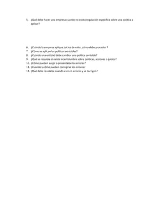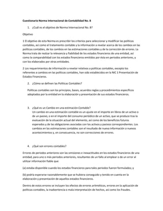 La Norma Internacional de Contabilidad No. 8 establece los criterios para seleccionar y modificar políticas contables, así como el tratamiento de cambios en las políticas, estimaciones y correcciones de errores. Los hechos posteriores a la fecha de cierre pueden requerir ajustes a los estados financieros o revelación de información relevante. La empresa debe asegurar que sus estados financieros presentan fielmente su situación financiera y resultados de operaciones.