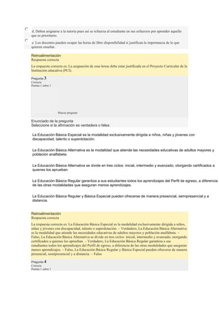 El documento presenta una serie de preguntas y respuestas sobre el currículo educativo en relación a la enseñanza del castellano, la educación básica especial y alternativa, y la distribución de horas en el plan de estudios. Se evaluaron las respuestas con una calificación perfecta de 5 de 5 en un tiempo de 10 minutos y 56 segundos. Las respuestas correctas se dieron a conocer para cada pregunta junto con retroalimentación específica.